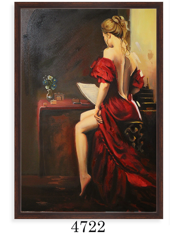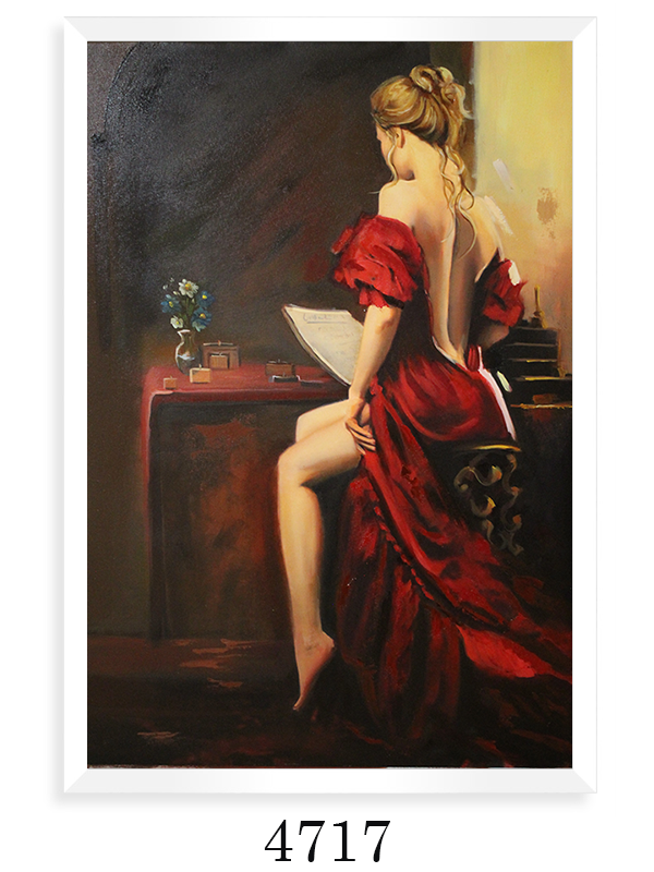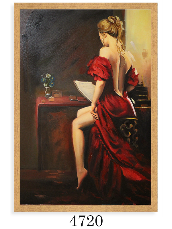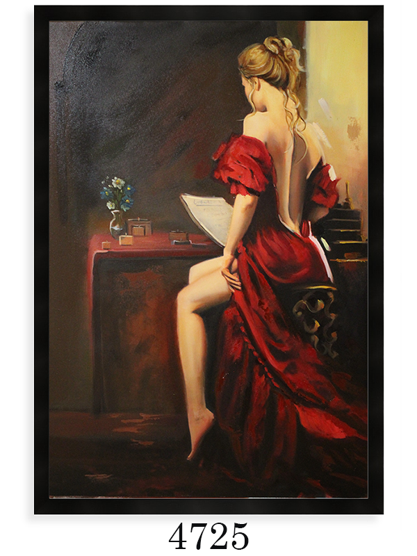 این نقاشی خیرهکننده، زنی را در لباسی بلند و سرخرنگ به تصویر میکشد که غرق در نتهای موسیقی است. او با ظرافتی خاص بر روی صندلی نشسته و پشت به بیننده دارد، در حالی که نور ملایمی از پنجرهای در سمت راست، فضای اتاق را روشن کرده است. جزئیات لباس و بافتهای پارچه با استادی تمام به تصویر کشیده شدهاند و چینوشکنهای آن زیبایی و شکوه خاصی به اثر بخشیدهاند. فضای کلی نقاشی حالتی رمانتیک و دلنشین دارد و گویی داستان ناگفتهای از احساسات و هنر را روایت میکند. استفاده از رنگهای گرم و نورپردازی حسابشده، عمق و حس آرامشبخشی به این تابلوی هنری بخشیده است. |